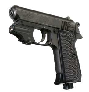Walther PPK/S Black with laser. A Class III gunsight laser with 2 LED indicators. Not mounted. Includes gun, laser, 2 batteries & 1 hex key.... ... Black slide PPK/S BB pistol. 15 Shot Magazine. CO2. Blow-back single-action. Laser is unmounted...
