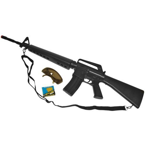 Description Real 1:1 Scale. 38.5" Long. Shoots around 250fps. Includes M16A2, Goggles, stock, small bag of bbs.